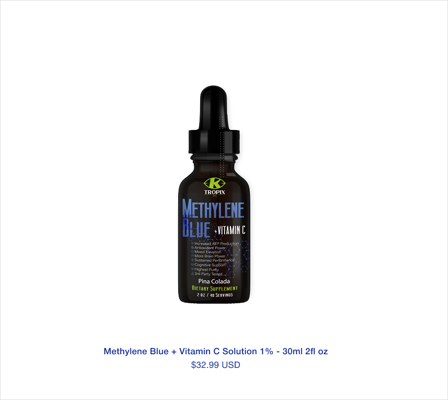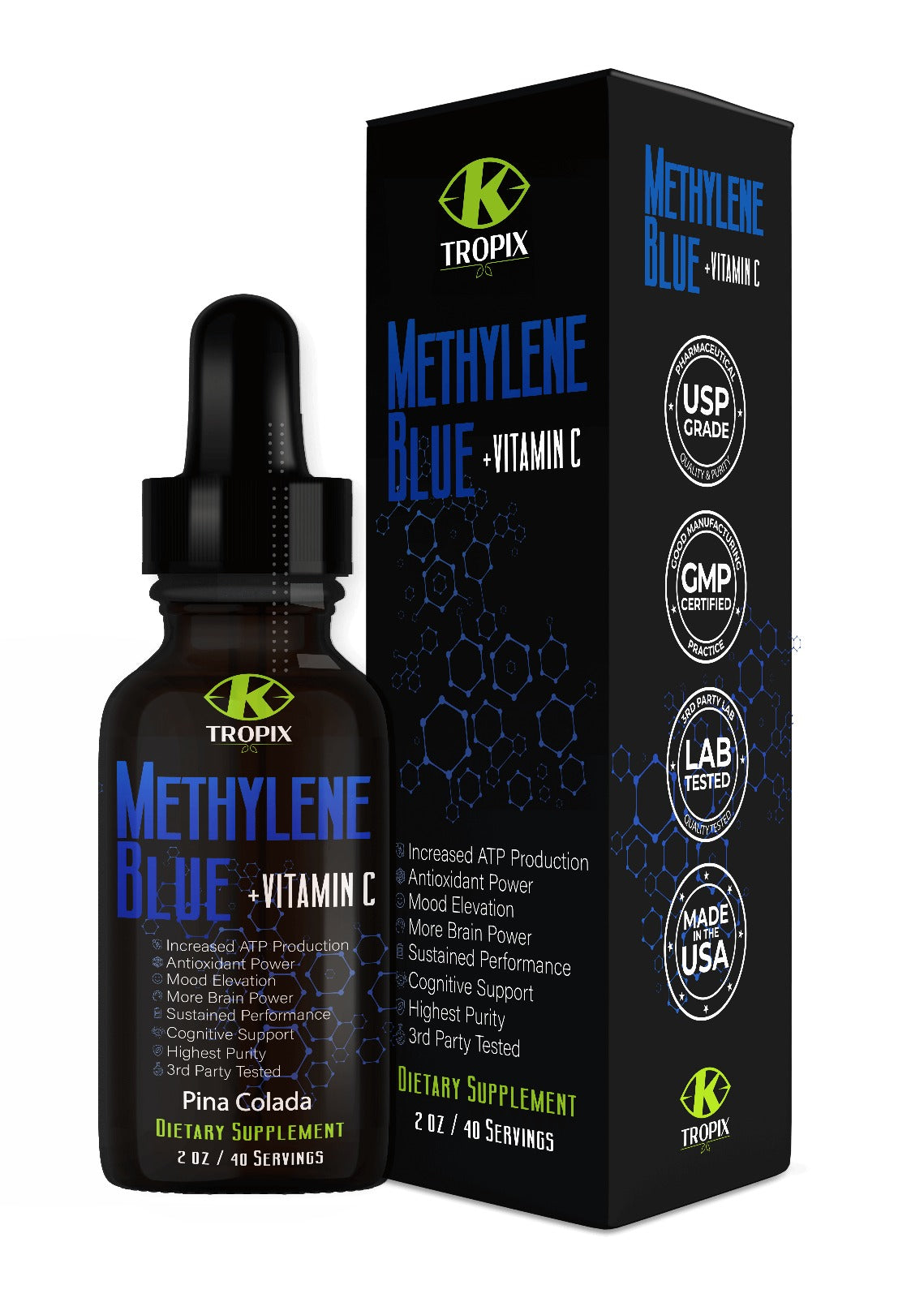 With the cleanest, most transparent ingredients on the market, K Tropix Methylene Blue (pharmaceutical grade) + Vit C has been proven to increased ATP Production, increase Antioxidants, Increased Mood, Increased Brain Power and Increased Reaction Time.